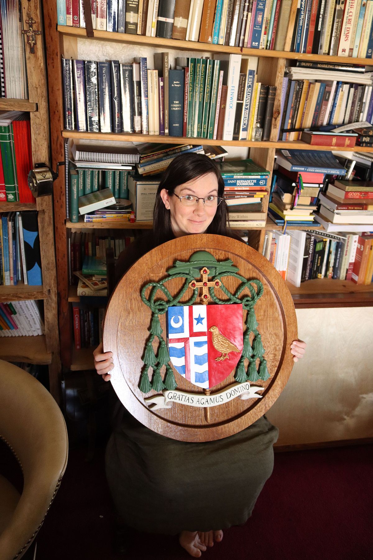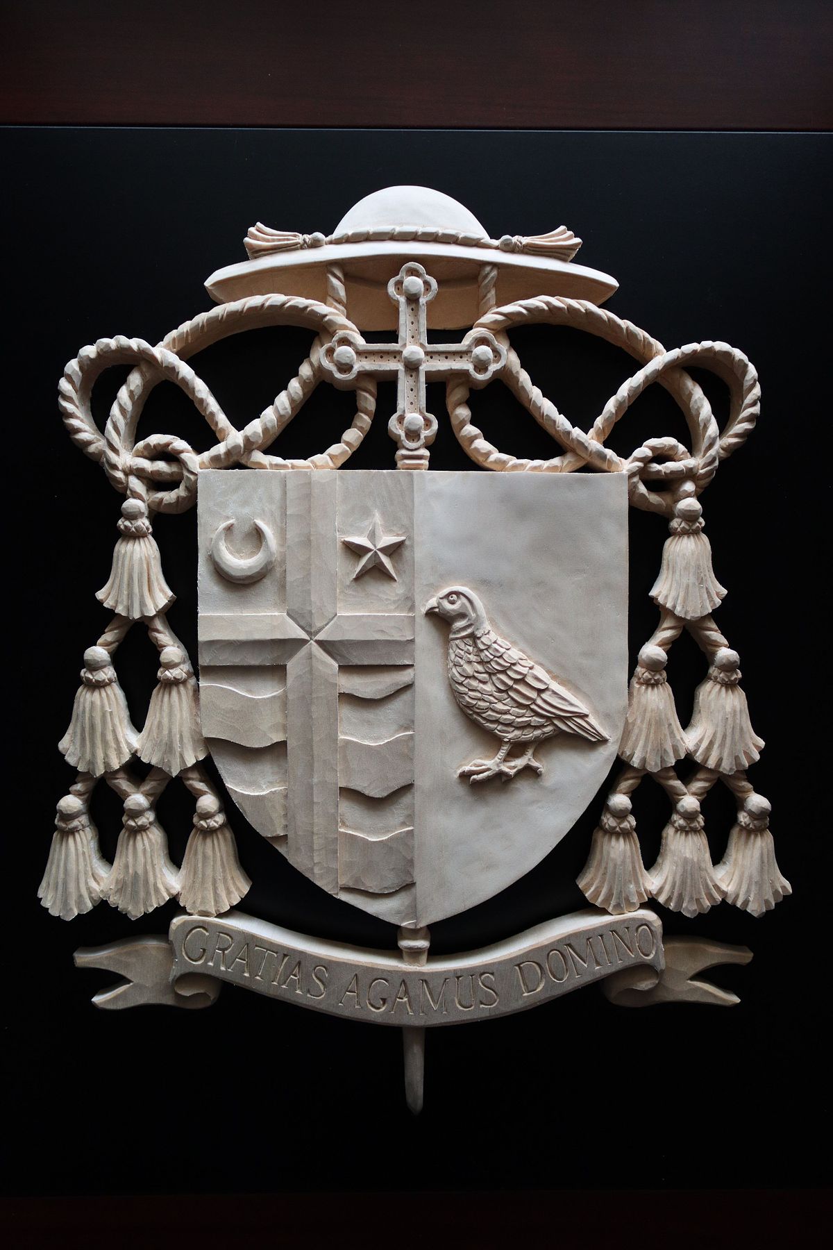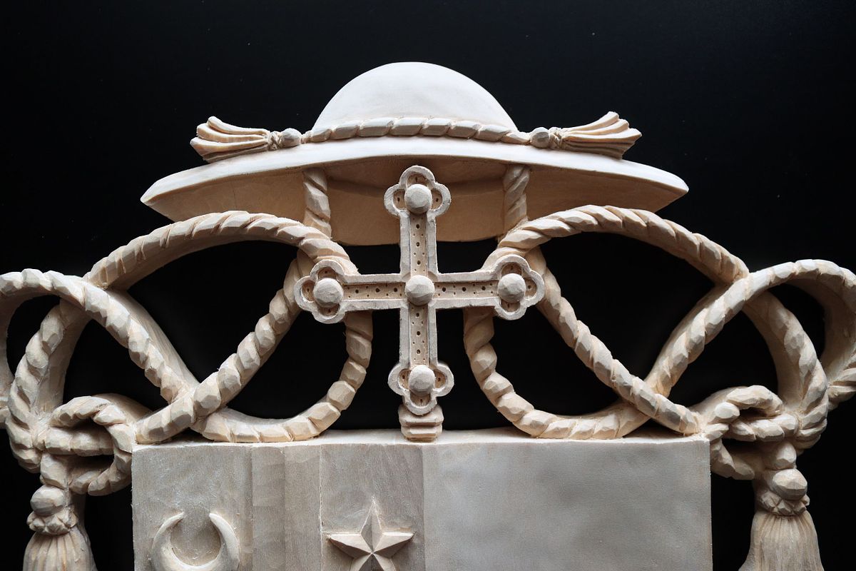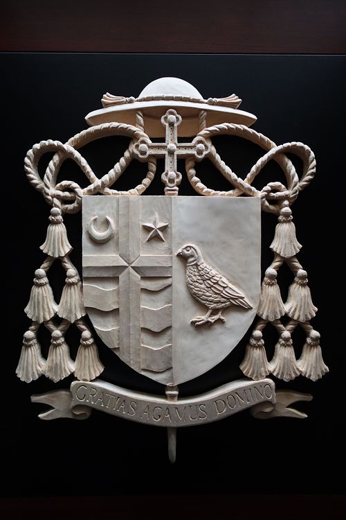 Architect William Heyer approached me on behalf of Bishop Shawn McKnight of Jefferson City to commission a custom, hand-carved coat of arms medallion for his new cathedra. You can see pictures of the overall cathedral remodel at Mr. Heyer's site: Cathedral of St Joseph :: William Heyer Architect