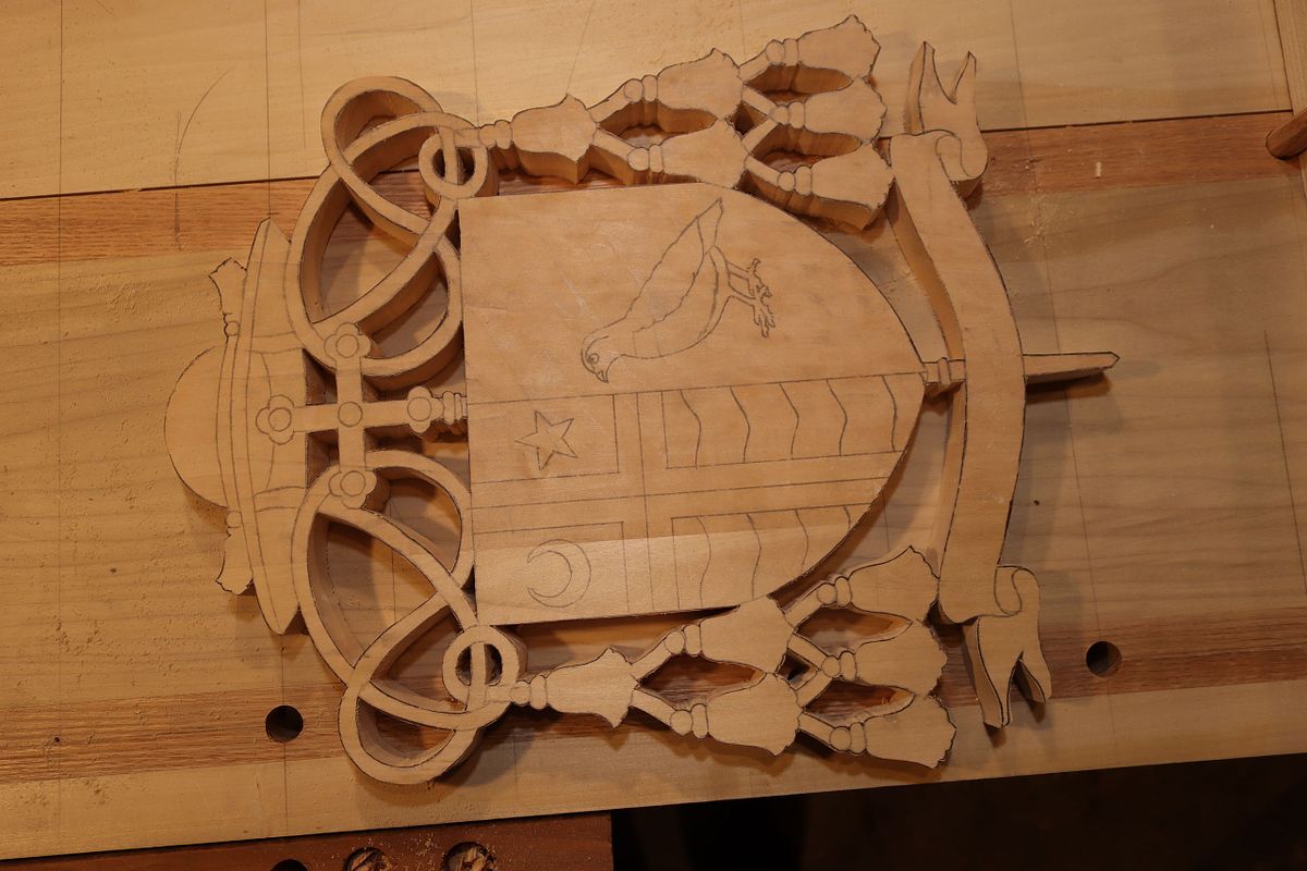 To match the rest of the woodwork in the cathedral, we used quartersawn white oak for the medallion and stained it to match. The coat of arms itself is basswood.